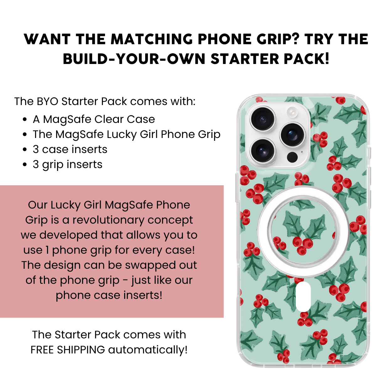 Introducing the Holly Jolly Clear Case Insert! Update your phone with this Christmas design by adding this holly insert to your collection! You can even upgrade the finish of your insert for a customized look!